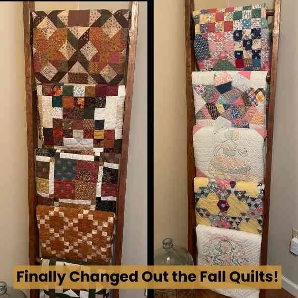 Such an improvement from last month! I curated 53 old quilts this month! Such an improvement from last month! If you are keeping track, I am up to 86 old quilts curated! This really came in handy when I was changing out one of my quilt ladders that is in my entryway. It is a bit embarrassing to admit this, but I hadn’t changed the quilts out since September! I didn’t even update the quilt for Christmas! Having many of the old quilts in a spreadsheet helped me with this. I could go through my list, find the ones I wanted to display, and find them so easily! YAY! Also, much to my surprise, while I was curating these quilts, I rediscovered an old “ugly” quilt. Wondering why it is so heavy, I peeked inside. There’s another old quilt in there! Woohoo!
