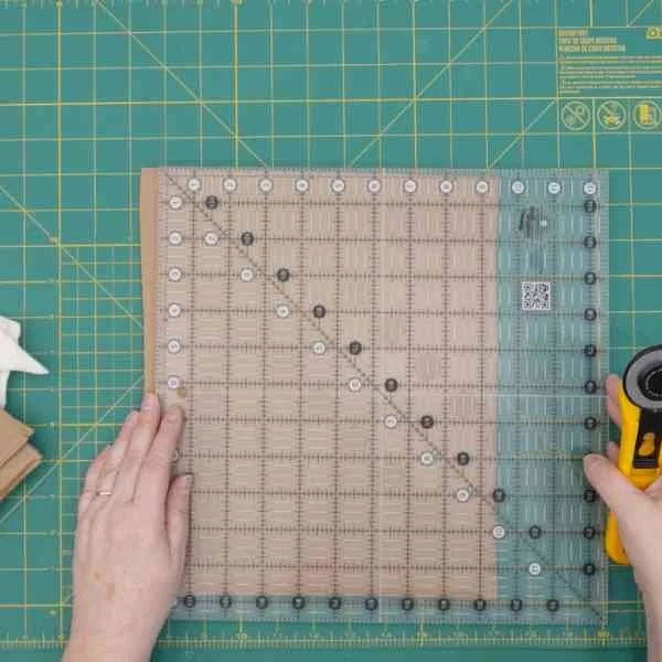 Once a size is decided, it is time to cut down the box. To get it into manageable pieces, I use electric scissors, but you can use a box cutter. Now that it is flat and cut into chunks, we can make it the size we need for our design board. For this, I use an old rotary cutter that is specifically for paper with an old blade in it from when I change my rotary blades. Cut out the desired size just like you would cut out a piece of fabric.