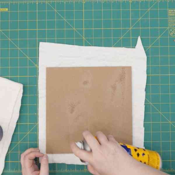 Now that we have cardboard cut to the desired size, it is time to adhere the batting scrap to the cardboard. There are a few things to keep in mind for this step: 1. If there is writing on the cardboard, you may see it through the box. That may be what you put on the back of the design board. 2. Make sure to use a non-lumpy glue. For example, if you use hot glue, there may be bumps or lumps on your design board. I like to use 505 Spray Adhesive, but a glue stick works well, too.