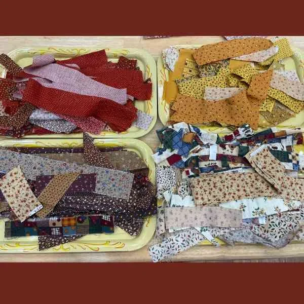 It all started this summer when I came across these rag wreaths at a thrift shop. I knew immediately what I was going to do with them—harvest the fabrics and make string quilts! I thought I only needed two (I should have bought them all!), but a few friends also bought the ones I left and gave them to me. I have the best friends!